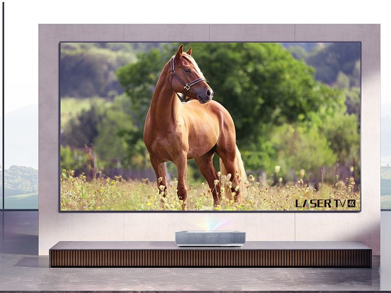 Das Projektionsverhältnis liegt bei 0,25, die Helligkeit wird vom Hersteller mit 2.600 ANSI-Lumen angegeben. Als statisches Kontrastverhältnis gibt der Hersteller 3.000:1 an. Der Laser-TV misst 656 x 121 x 319 Millimeter, die Leinwand wiegt 14 Kilogramm und ist 38 Millimeter dick. Bildsignale kann das Modell über zweimal HDMI 2.1 und einmal HDMI 2.0 mit eARC erhalten, ein optischer Ausgang steht bereit - falls die beiden 20-Watt-Lautsprecher nicht ausreichen.