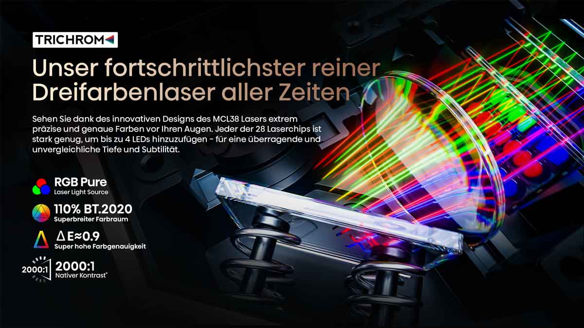 Für die Bilderzeugung nutzt der C2 Pro drei farbige Laser, wodurch sich der BT.2020-Farbraum zu 110 Prozent und mit einer Farbabweichung von Delta E kleiner 1 wiedergeben lassen soll. Die Helligkeit wird mit 2.600 Lumen angegeben, wodurch sich auch bei nicht perfekter Abdunklung ein eindrucksvolles Bilderlebnis ergeben dürfte.