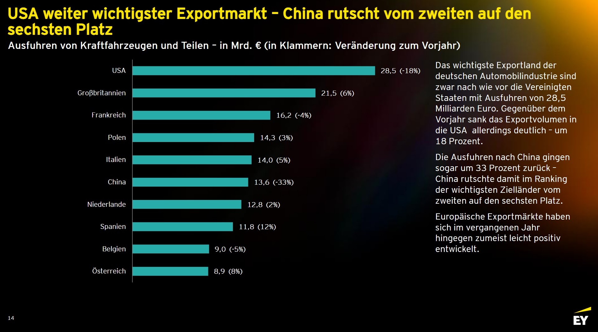 Den ultimativen Tiefschlag verpasst der globale Markt der strauchelnden europäischen Industrie. Die Exporte in die USA, den mit 28,5 Milliarden Euro Umsatz noch immer wichtigsten Abnehmer deutscher Fahrzeuge, sind im vergangenen Jahr um katastrophale 18 Prozent eingebrochen. Noch dramatischer ist der Absturz in Fernost. China ist als Exportmarkt vom zweiten auf den sechsten Platz abgerutscht. Die Ausfuhren in die Volksrepublik sanken auf den tiefsten Stand seit dem Jahr 2009.