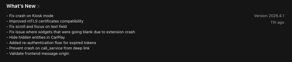 Eine neue Version der Home Assistant-App für iOS ist erschienen. Version 2026.4.1 wurde nur wenige Wochen nach dem vorherigen Update 2026.4.0 veröffentlicht, das unter anderem den Kiosk-Modus sowie die Unterstützung für Apple-Watch-Ordner eingeführt hatte.