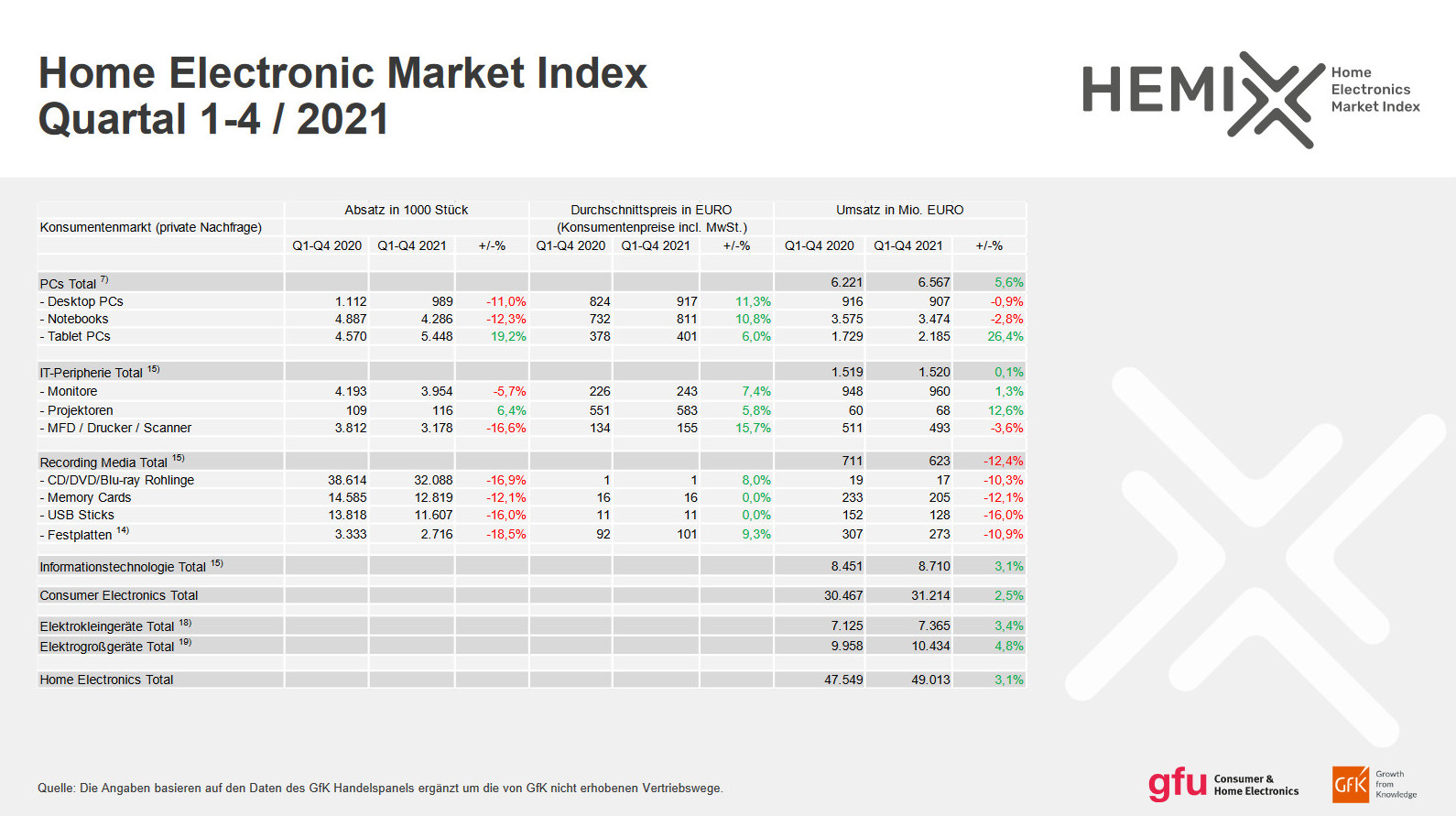 Der HEMIX Home Electronics Market Index Q1 bis Q4/2021 zeigt, dass der Markt für Consumer Electronics und Elektrohaushaltsgeräte im vergangenen Jahr erneut wachsen konnte. Allerdings hat sich die insgesamt weiterhin positive Entwicklung im Vergleich zu 2020 etwas abgeschwächt. So zeigt beispielsweise der rückläufige Absatz von TV-Geräten, dass die pandemiebedingte Sonderkonjunktur zu Ende ist.