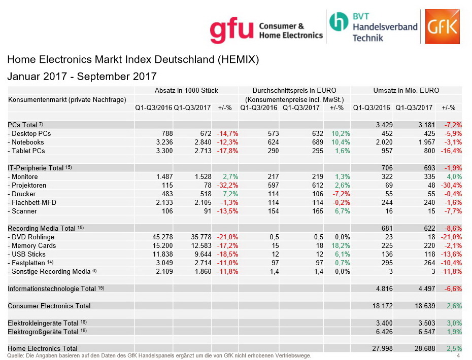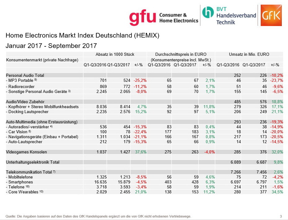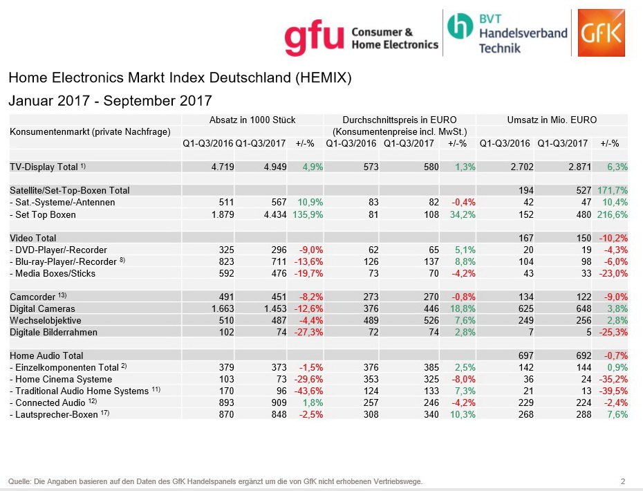 Gut lief es für Fernsehgeräte. In den ersten drei Quartalen 2017 stieg der Umsatz auf knapp 2,9 Milliarden Euro - ein Wachstum von 6,3 Prozent im Vergleich zum Vorjahr. Die Verkaufszahlen stiegen um 4,9 Prozent auf knapp 5 Millionen. Stark: Rund 4,4 Millionen verkaufte Set-Top-Boxen bedeuten ein Plus von knapp 136 Prozent gegenüber dem Vorjahr und damit ein Umsatzwachstum von knapp 217 Prozent auf 480 Millionen Euro.
