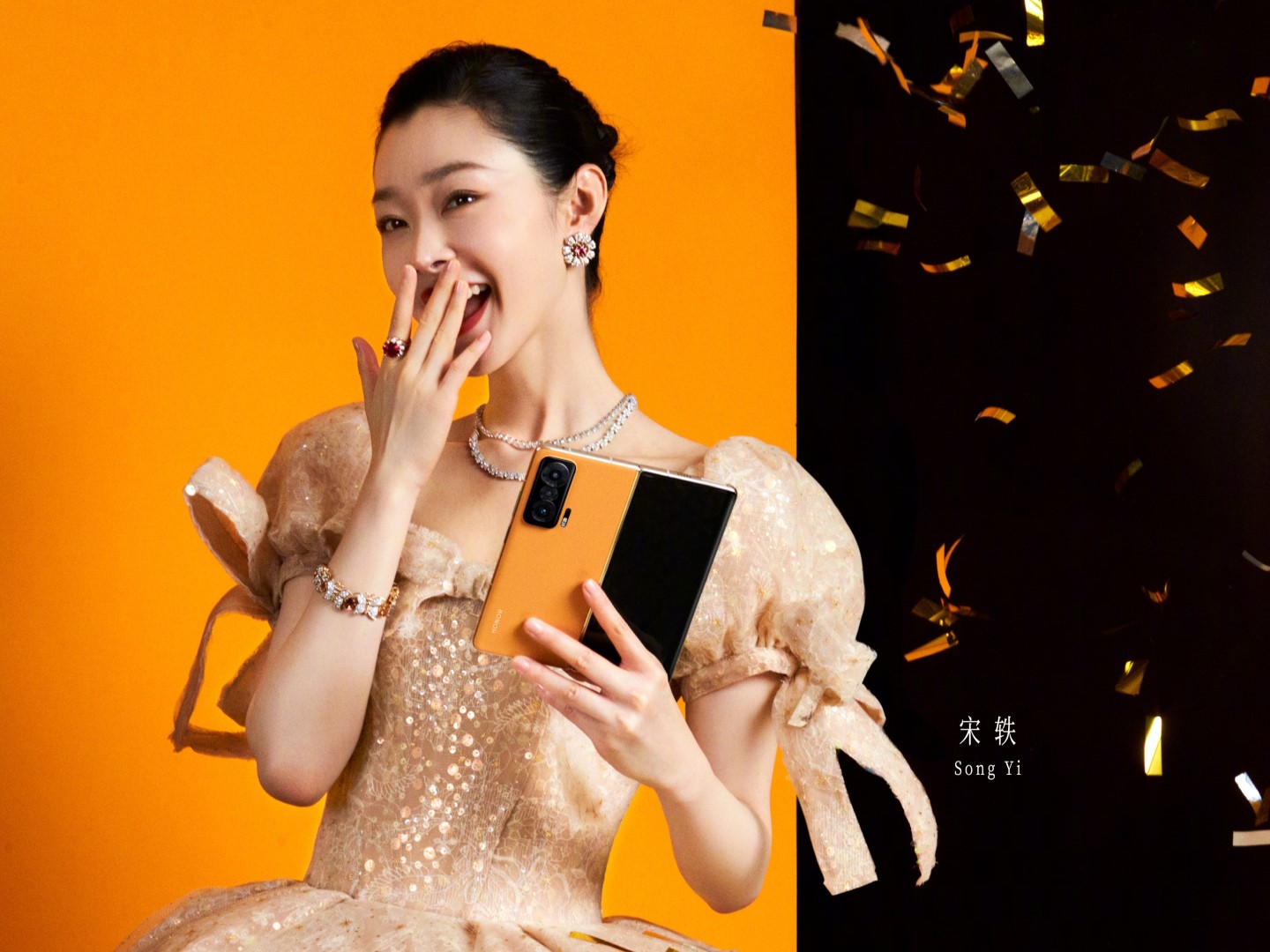Es scheint sich um das 25-Jahr-Jubiläum von Esquire in China zu handeln, wie das Werbeposter unten verrät. Veröffentlicht wurde es im chinesischen Weibo-Profil des Modemagazins Esquire und es ist durchaus auch für Tech-Fans interessant, denn hier sehen wir erstmals das Honor Magic V vollständig und in einer sehr schicken orangenen Farboption, offenbar mit veganem Leder überzogen.