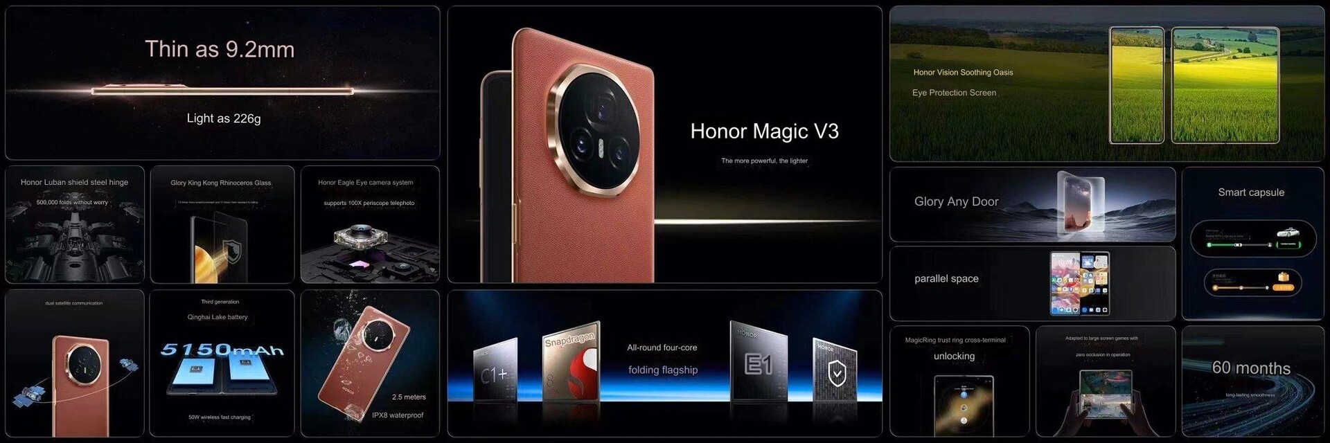 Honor betont, dass die neue Scharniertechnologie nicht nur leichter und dünner sondern auch wieder robuster und langlebiger geworden ist, das Foldable ist nach IPX8 wasserdicht aber nicht wie Samsungs neue Foldable-Generation offiziell begrenzt staubdicht. Auch die beiden Displays sollen widerstandsfähiger sein, beim Coverdisplay nutzt Honor sein "Rhino Glass" benannte Technologie, am flexiblen AMOLED an der Innenseite soll eine "King Kong" bezeichnete Nano-Aluminium-Oxid-Beschichtung für Schutz sorgen, angeblich 5x stärker als traditionelle Standards, wobei unklar ist, wer damit konkret gemeint ist.
