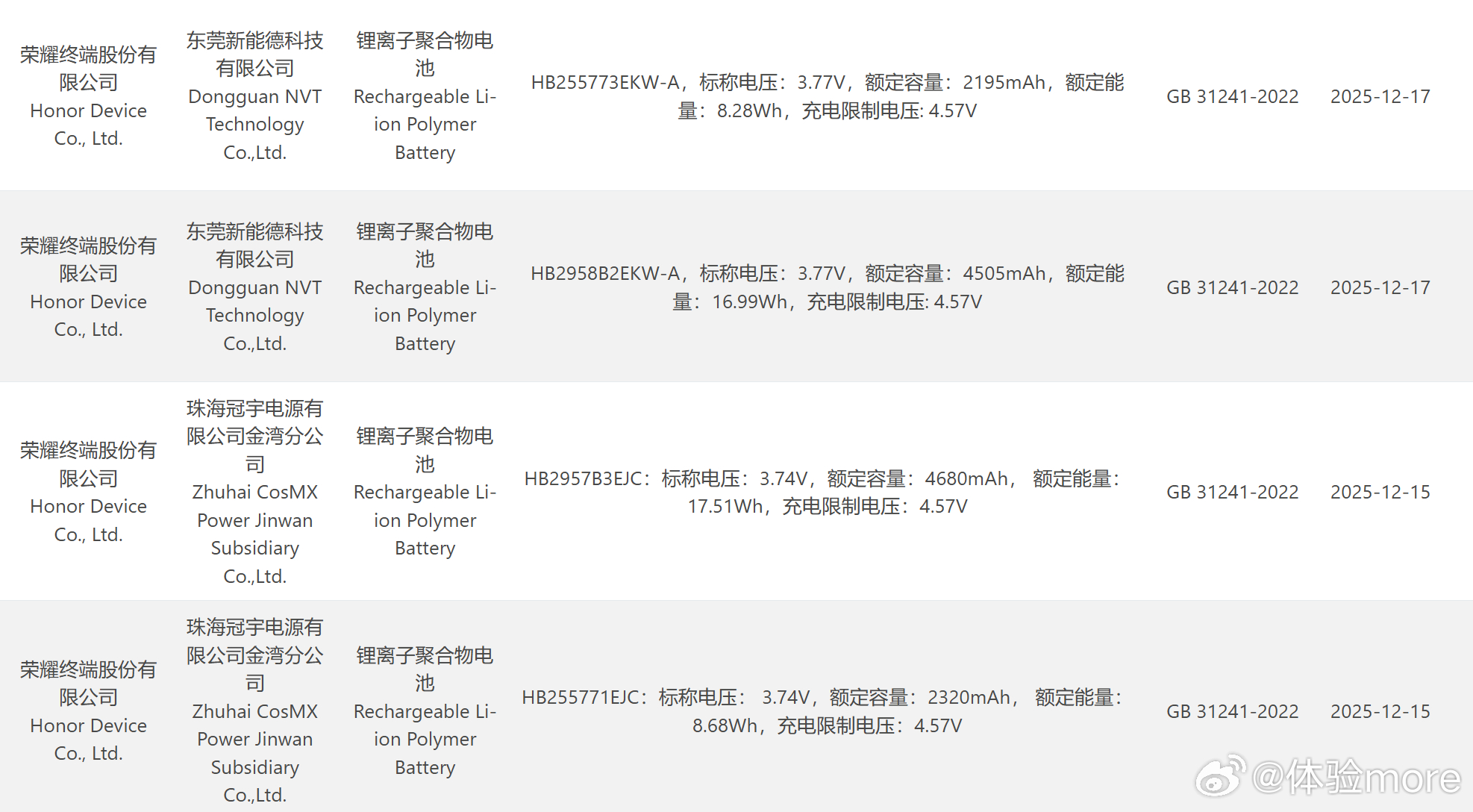 Eine etwas seltsame Produktpolitik, die sich aber offenbar auch 2026 im China-Modell des Honor Magic V6 wiederfinden wird, wie eine Zertifizierung in China verrät. Wie der Screenshot aus der 3C-Datenbank verrät, wird es das Honor Magic V6 in einer Top-Version mit 2.320 mAh und 4.680 mAh Akkus geben, gemeinsam sind das 7.000 mAh netto beziehungsweise vermutlich 7.150 mAh typischer Kapazität im Datenblatt. Die anderen Versionen dürften mit 2.195 mAh und 4.505 mAh etwas weniger Akkulaufzeit bieten und gemeinsam auf 6.700 mAh beziehungsweise 6.850 mAh Kapazität kommen, beides in jedem Fall deutliche Steigerungen im Vergleich zum Vorgänger.