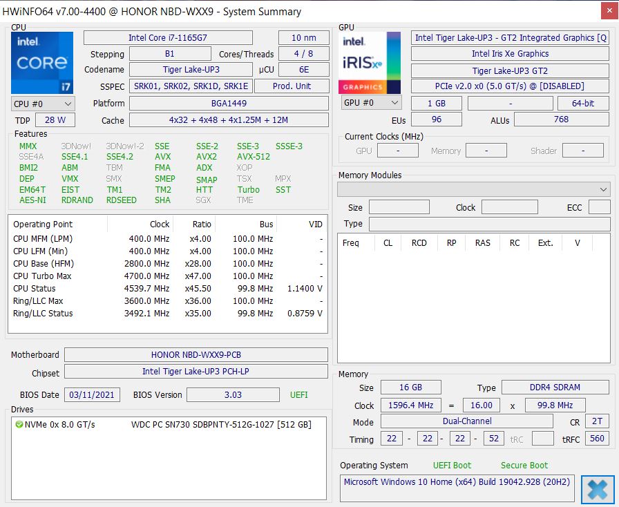 Der hier eingesetzte Intel Core i7-1165G7 ist ein Prozessor mit vier Kernen, der bis zu acht Aufgaben gleichzeitig bearbeiten kann. Die Taktraten liegen dabei zwischen 2,8 und 4,7 GHz, wobei die tatsächliche Leistung auch vom eingestellten TDP abhängt. Hier setzt Honor mit einem PL1 von 28 W und einem PL2 von 60 W auf die maximal mögliche Konfiguration, wodurch das MagicBook 14 mit Tiger-Lake-CPU in den Benchmarks gute Ergebnisse im oberen Bereich unseres Testfelds erzielt.