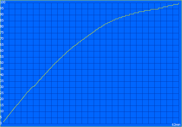 Der 75-Wh-Akku ermöglicht sehr gute Laufzeiten bei angepasster Helligkeit von 150 cd/m² (entspricht beim Testgerät 55% der maximalen Helligkeit). Bei 60 Hz läuft unser WLAN-Test für etwas mehr als 12 Stunden Minuten und mit 165 Hz noch 9:20 Stunden. Wenn man die volle Displayhelligkeit nutzt sind es rund 6 Stunden, hier hat auch die höhere Frequenz keinen großen Einfluss mehr (359 Minuten mit 165 Hz). Unser Videotest mit 150 cd/m² läuft für etwas mehr als 13 Stunden, unter maximaler Last und voller Helligkeit kann man den Akku aber auch in 58 Minuten leeren. Ein vollständiger Ladevorgang bei eingeschaltetem Gerät dauert lediglich 62 Minuten und 80 % stehen bereits nach 34 Minuten wieder zur Verfügung.