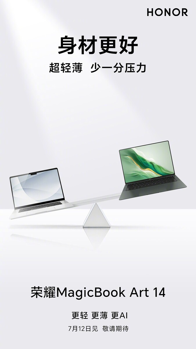 Auch zum neuen Honor Laptop gibt es neue Teaserplakate und viele Photos. Das 14 Zoll Notebook kommt in dunklem Grün oder ganz in Weiß und ist offenbar ein Intel-Design, wie eines der Bilder weiter unten verrät. Welcher Chip da konkret drin steckt ist noch nicht bekannt. Nachdem der Launch bereits am 12. Juli über die Bühne geht, gehen wir mal davon aus, dass es sich noch nicht um einen Lunar Lake Prozessor handeln wird, der ja erst ab September verfügbar sein soll, obwohl Honor durchaus mit dem Modewort "AI-PC" wirbt.
