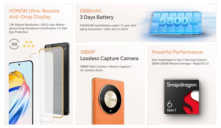 Laut des Marketings von Honor handelt es sich dabei um ein "Ultra-Bounce-Display" mit 360-Grad Anti-Drop-Schutz. Denn das Frontglas wird durch eine gepolsterte Schicht mit dem Gehäuse verbunden, wobei es sich laut Honor um eine Weltneuheit handelt. Eine weitere Besonderheit ist der 5.800 mAh Akku, der eine Laufzeit von drei Tagen ermöglichen soll, und der über USB-C mit bis zu 35 Watt aufgeladen werden kann. Um diese Laufzeit zu erreichen, setzt Honor auf den 4 nm Qualcomm Snapdragon 6 Gen 1.