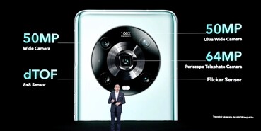 Das Magic4 Pro verfügt darüber hinaus eine 64 MP Tele-Kamera mit einem Sensor im 1/2 Zoll Format und 3,5-fachem optischen Zoom, in Verbindung mit digitaler Vergrößerung verspricht Honor einen 100-fachen Zoom-Faktor. Das günstigere Modell setzt dagegen auf eine 8 MP Tele-Kamera mit fünffachem optischem Zoom. Ein ToF-Sensor findet sich im Kameramodul beider Modelle.