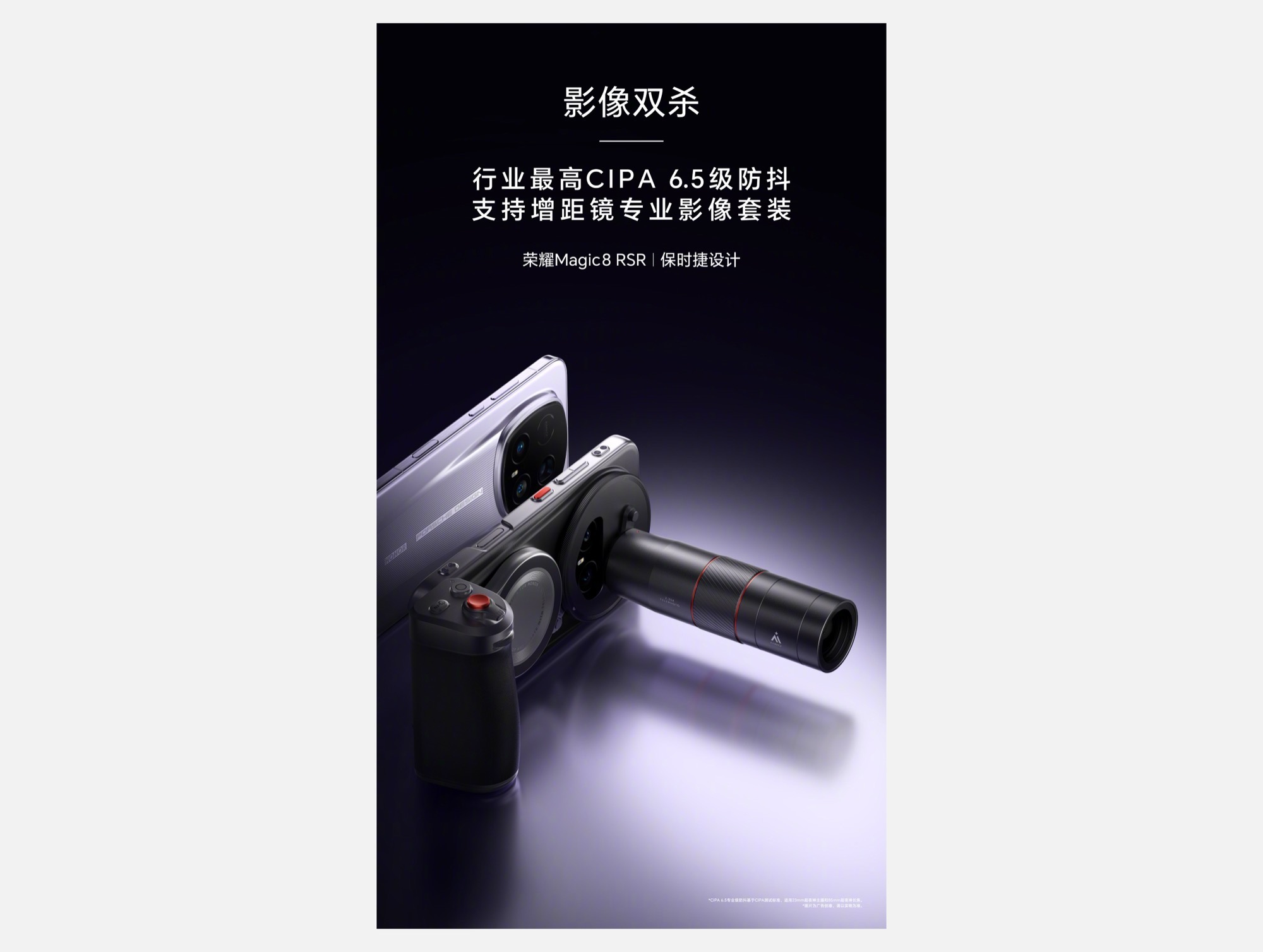 Zweitens kommt das Kit mit einem Handgriff, der magnetisch an der Hülle halten dürfte. Dieser besitzt einen Auslöser samt Zoom-Regler, ein wahrscheinlich programmierbares Einstellrad, einen Einschaltknopf und eine weitere Funktionstaste. Das Herzstück des Kamera-Kits ist aber das "AiMage"-Objektiv, das vor die 200 Megapixel Periskop-Tele-Kamera des Honor Magic8 RSR Porsche Design geschraubt werden kann, um deren Brennweite auf das 2,35-fache zu verlängern.