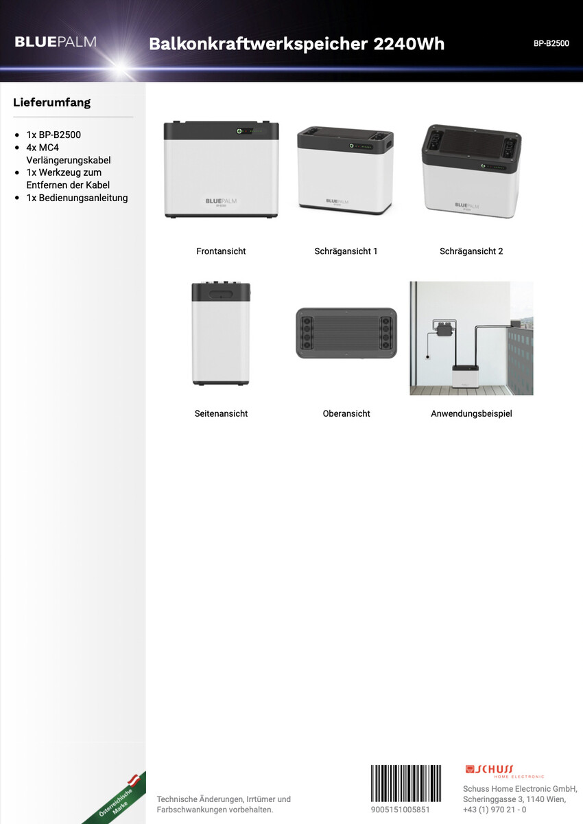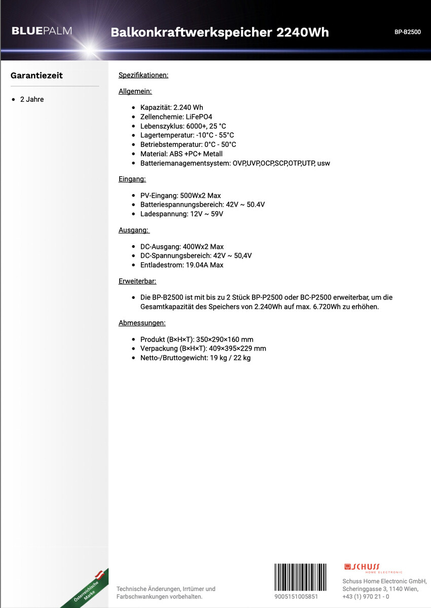 Hornbach bietet einen Stromspeicher mit einer Speicherkapazität von 2.240 Wh jetzt mit 17 % Rabatt an. Der Speicher wird unter dem Markennamen BluePalm vertrieben und ist auch bei anderen Händlern unter weiteren Labels erhältlich (Marstek, Plentisolar, Greensolar, Blue Palm, Be-Cool und neuerdings auch bei Pearl). Der Hersteller dahinter ist Hametech / Hamedata.
