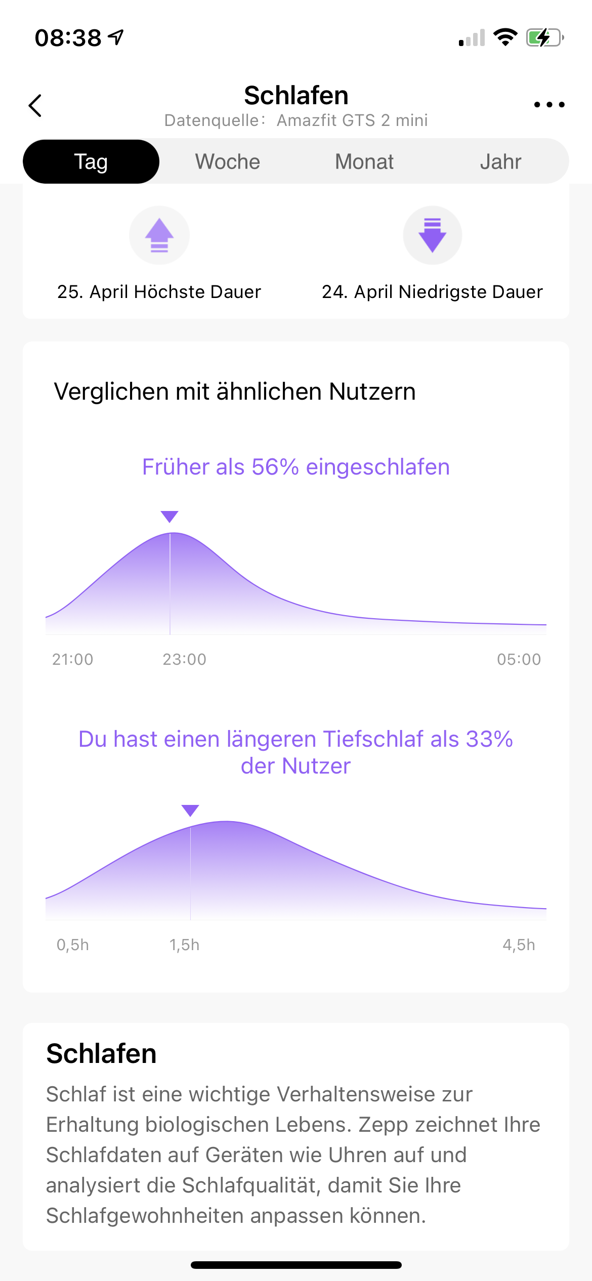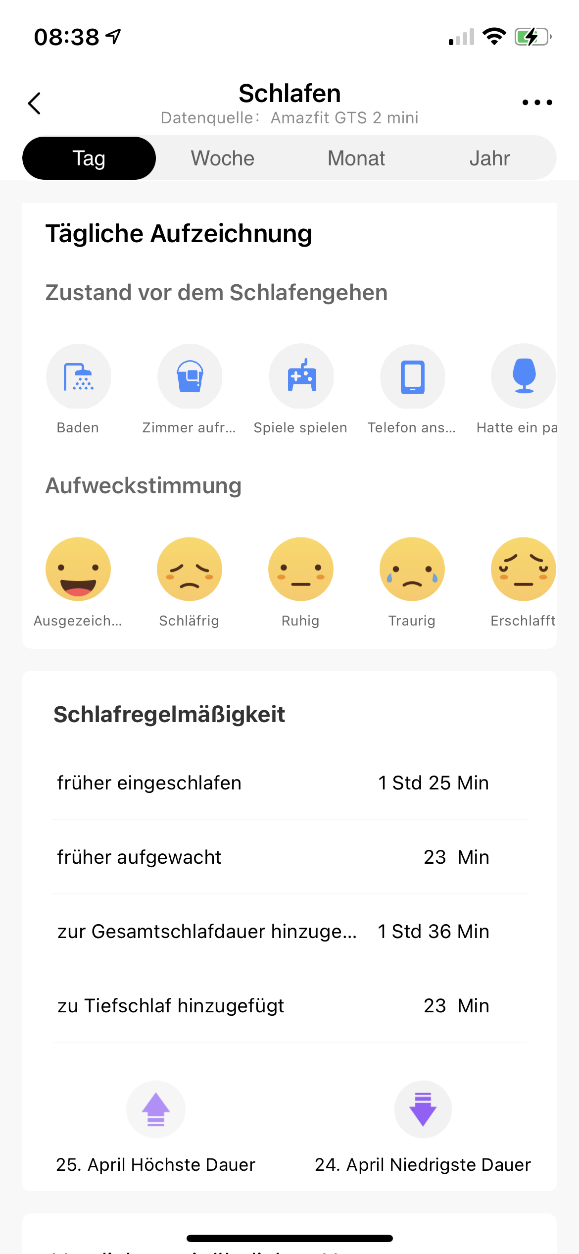 Auch hier haben wir für die exemplarische Darstellung des Protokolls bewusst dasselbe Datum gewählt wie für den Test der Amazfit GTS 2e: Trotz gleicher Rahmenbedingungen wie der Intensität für die Pulsmessung sind die beiden Protokolle nicht identisch. Auffällig ist unter anderem die unterschiedliche Bewertung der Atmungsqualität, die die Amazfit GTS 2 mini als schwach bewertet, die Amazfit GTS 2e dagegen mit mild.