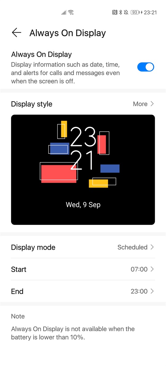 Eines der Neuigkeiten in EMUI 11 ist das erweiterte Always-On-Display, das in Bildern und einem Video unten zu sehen ist. Neu sind Stile, die dem AOD etwas mehr grafische Rafinesse verleihen, etwa der Mondrian-Style im Bild oben. Die jeweiligen Stile lassen sich auch adaptieren und etwa von Bildern in Form einer Vorlage übernehmen. Ebenfalls möglich: Einen ganz neuen Stil aus eigenen Bildern erstellen, das inkludiert animierte GIFs oder Live Photos. Auch der Import aus dem Huawei Theme Store ist möglich.