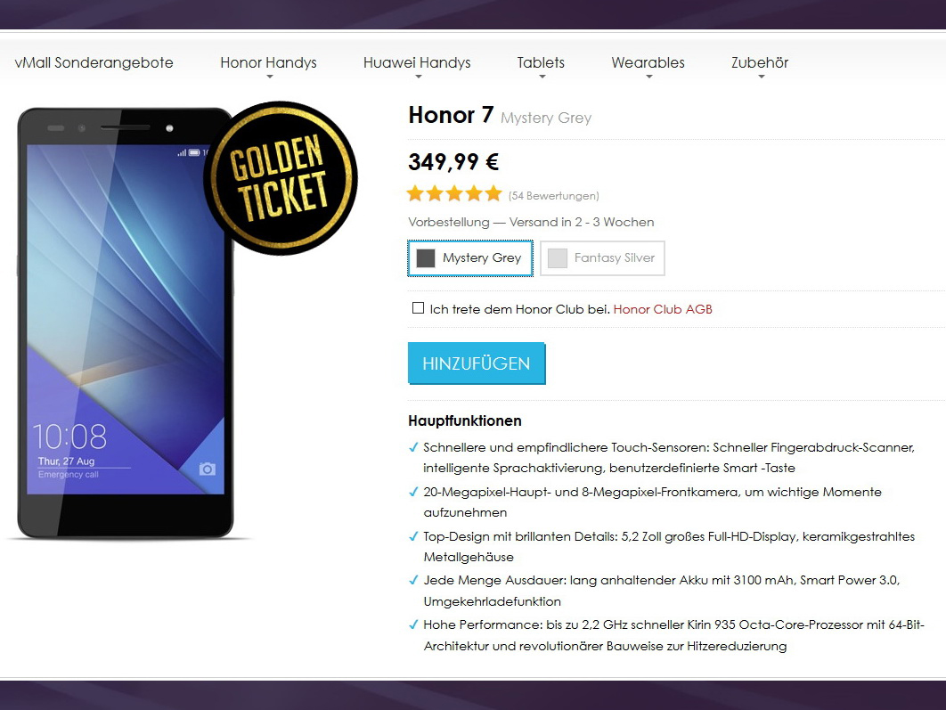 Zur Teilnahme am Golden Ticket Gewinnspiel sind laut Honor alle volljährigen Käufer aus Belgien, Deutschland, Frankreich, Griechenland, Italien, Luxemburg, den Niederlanden, Portugal, Spanien und UK berechtigt, die ein Honor 7 Smartphone im Zeitraum von 7. bis 14. September 2015 via vmall.eu erwerben. Die Teilnehmer müssen sich mit ihrem Namen, Email-Adresse und IMEI oder der Bestellnummer registrieren. Viel Glück.