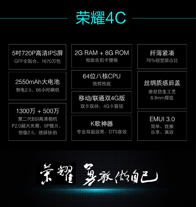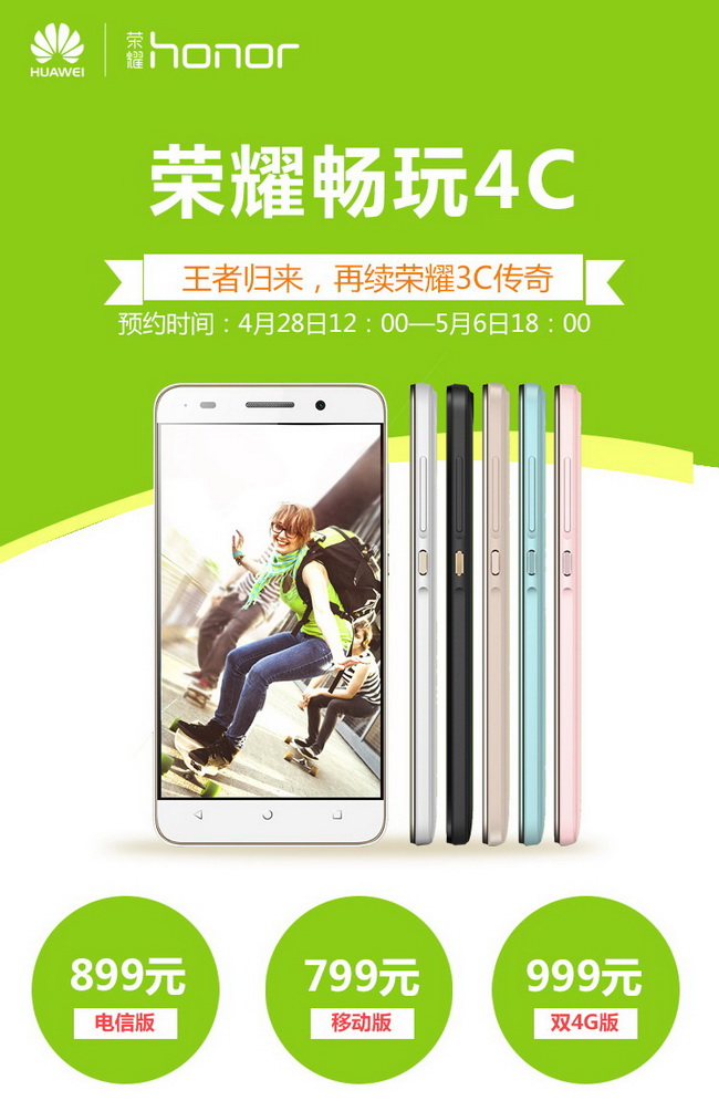 Das rund 162 Gramm schwere Honor 4C ist als Nachfolger des Honor 3C in den Farboptionen Blau, Gold, Pink, Schwarz und Weiß verfügbar. Zum weiteren Featureset des 143,3 x71,9 x 8,8 Millimeter messenden LTE-Smartphones zählen neben Dual-SIM-Unterstützung (micro-SIM, Dual Stand-by), microSD-Kartenslot, WLAN 802.11 b/g/n auch Bluetooth 4.0 und Android 4.4 KitKat mit Emotion UI 3.0 als Mobile-OS.