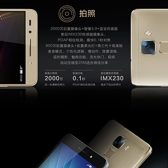 Das 5,2"-Full-HD-Display von JDI zeigt 1920 x 1080 Pixel und soll 85 Prozent des NTSC-Farbraums abdecken. Als Kontrastverhältnis nennt Huawei für das Panel 1500:1. Wie das MX5 verfügt auch das Honor 7 über einen hochwertigen Sony Exmor RS Bildsensor des Typs IMX230 mit 21 MPixeln und einem 6-linsigen Objektiv sowie Blende f/2.0 für die Hauptkamera. Die Selfiecam des Honor 7 hat allerdings 8 MP und ein 26-mm-Objektiv mit Offenblende f/2.4. Der Fingerabdruckleser auf dem Backcover soll das Smartphone in nur 0,5 Sekunden entriegeln und unterstützt Payments in China via Baidu oder Alipay