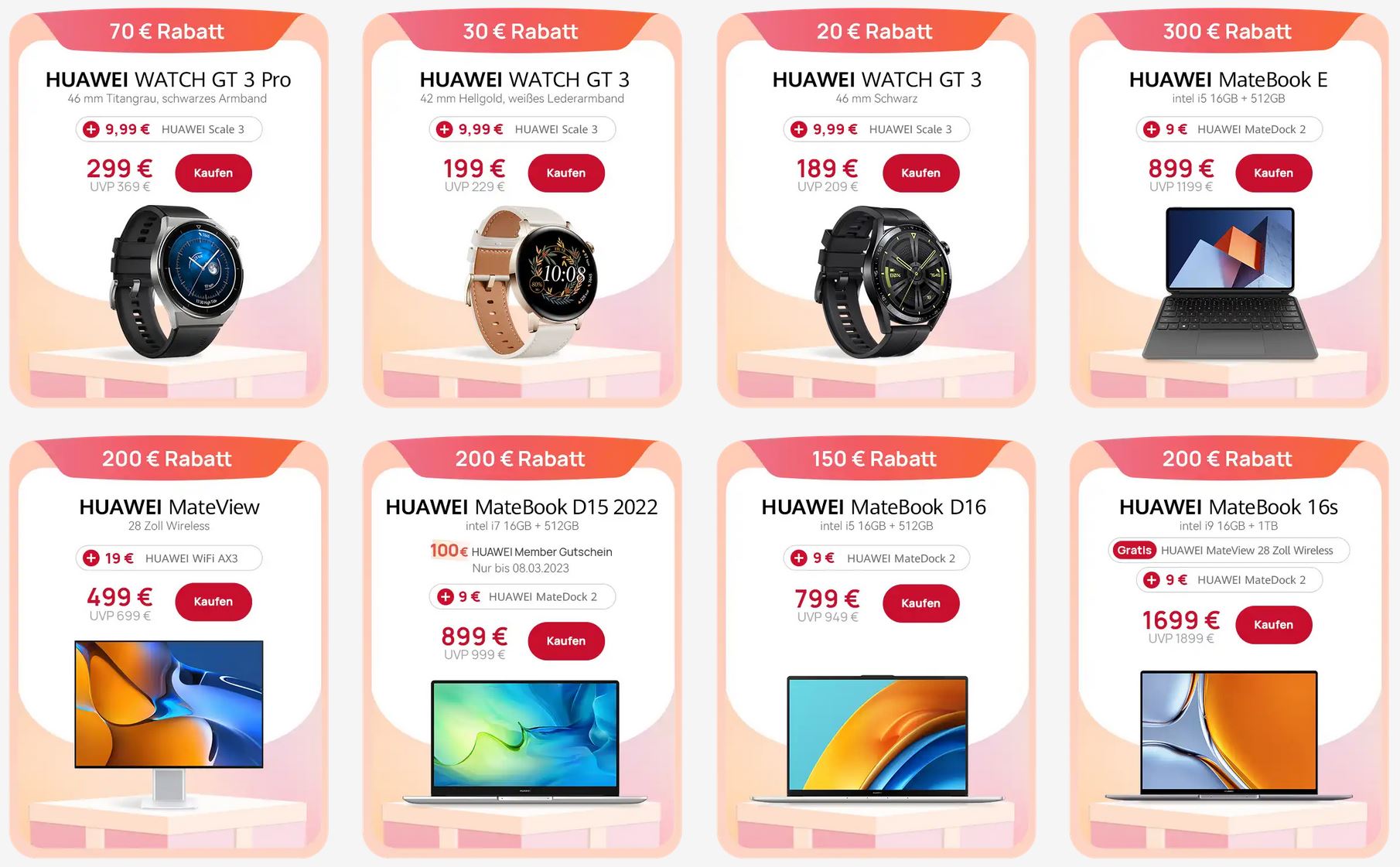 Huawei hat Jubiläums-Angebote anlässlich des 3. Geburtstag des eigenen Online-Shops gestartet. Vom heutigen 1. bis zum 15. März bietet der Hersteller im seinem Online-Store viele Produkte zu stark reduzierten Preisen, darunter Smartwatches, MateBooks und Ohrhörer.