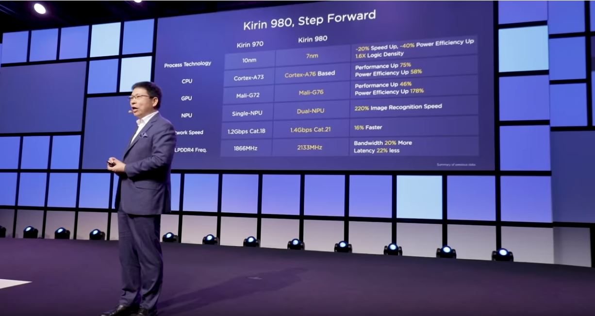 Der Kirin 980 soll im Vergleich zum Kirin 970 um +75 % bei der Performance zulegen, zudem aber 58 % effizienter als dieser sein. Beim GPU-Part spricht Huawei von einer Leistungssteigerung von 46 % im Vergleich zur Mali-G72 im Kirin 970 bei einer Effizenzsteigerung von 178 %.