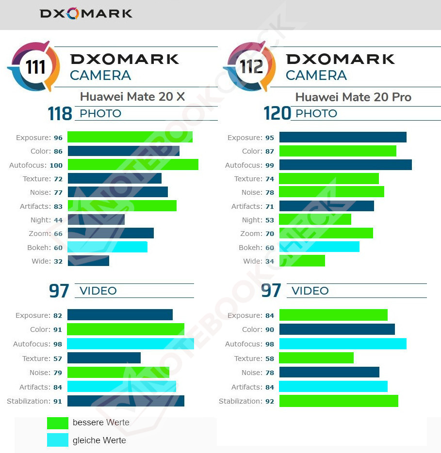 Im Huawei Mate 20 X arbeitet eine Triplekamera-Konfiguration wie im Huawei Mate 20 Pro, mit Weitwinkel, Ultraweitwinkel und Tele. Mit einem Gesamtscore von 111 Punkten im Dxomark Camera rangiert das Huawei Mate 20 X auf Platz 16 in der aktuellen Top 20 der besten Smartphones. Am Ende platziert sich das Mate 20 X nur einen Punkt hinter dem Huawei Mate 20 Pro mit 112 Punkten. Da beide Handys eine sehr ähnliche Kamerahardware aufweisen, erzielen beide Smartphone in den Testkategorien vergleichbare Ergebnisse.