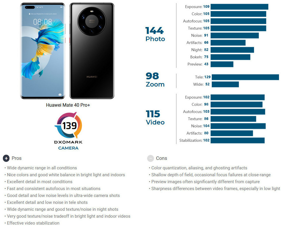 Neben einem sehr großen Dynamikumfang unter allen Aufnahmebedingungen biete das Mate 40 Pro+ von Huawei auch eine gelungene Farb- und Weißabgleichabstimmung, die Detailzeichnung sei in den häufigsten Aufnahmesituationen exzellent, so Dxomark im Fazit. Aber selbst der neue Klassenprimus bietet gemäß Dxomark noch Spielraum für Verbesserungen. So stören auch beim Spitzenhandy ab und an auftretende Fehlfarben, Aliasing und Geisterbilder/Artefakte. Auch die gelegentlichen Fokusfehler im Nahbereich, die wenig akuraten Vorschaubilder sowie die teils deutlich wahrnehmbaren (besonders bei schlechten Lichtverhältnissen) Schärfeunterschiede zwischen Videobildern.