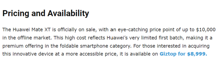 So findet man das Mate XT aktuell etwa um 8.366 Euro bei Aliexpress, der Händler gewährt einen großzügigen Rabatt von 20 Prozent auf den eigentlichen Preis von über 10.000 Euro. Auch Gizmochina ist sich nicht zu schade, allen Ernstes von einem exklusiven Rabatt und einem "zugänglicheren Preis" von knapp 9.000 US-Dollar zu schreiben, den der Importhändler Giztop gewährt - auf die 256 GB Version versteht sich (siehe oben). Offiziell kostet das Mate XT in China übrigens 20.000 Yuan (2.540 Euro) und ist damit natürlich ebenfalls nicht gerade billig, ein vierfaches dieses Preises sollte aber niemand für das Mate XT bezahlen, egal wie exklusiv das Produkt aktuell ist.