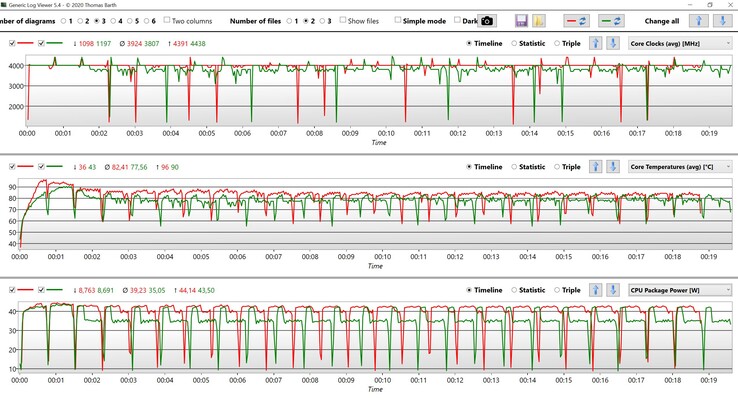 Bei der Cinebench-R15-Multi-Schleife sieht man deutlich, dass es zwischen den beiden Leistungsmodi nur einen vernachlässigbaren Unterschied gibt. Die Kühlung des MateBook 13s arbeitet aber gut, denn zu Beginn der Last arbeitet der Prozessor mit mehr als 40 Watt und auch die nominellen 35 Watt können problemlos gehalten werden. Das schwache Abschneiden in den Benchmarks liegt also einzig und alleine and dem Core i5-11300H selbst; mit einem aktuellen AMD-Chip oder gar einem neuen Alder-Lake-Prozessor würde die Leistung deutlich besser ausfallen. Das größere MateBook 14s darf mit dem Core i7-11370H 45 Watt verbrauchen und ist damit ein wenig schneller, aber auch hier wird man in der Praxis keinen Unterschied erkennen.