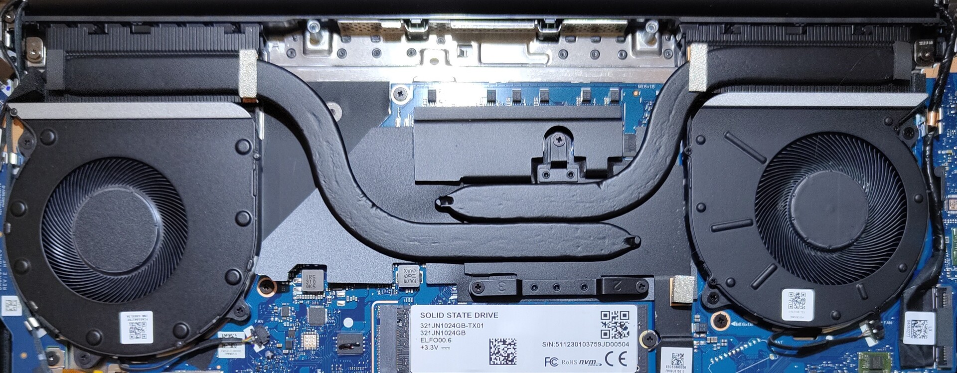 Im Inneren gibt es allerdings nicht viele Wartungsmöglichkeiten. Der Arbeitsspeicher und das WLAN-Modul sind verlötet. Um den Akku zu entfernen, müssen weitere Schrauben gelöst werden, von denen eine mit einem Sigelsticker versehen ist. Erfreulich ist, dass sich die beiden Lüfter ohne das komplette Kühlsystem entfernen lassen, was die Reinigung der Kühlrippen und Lüfter erleichtert.
