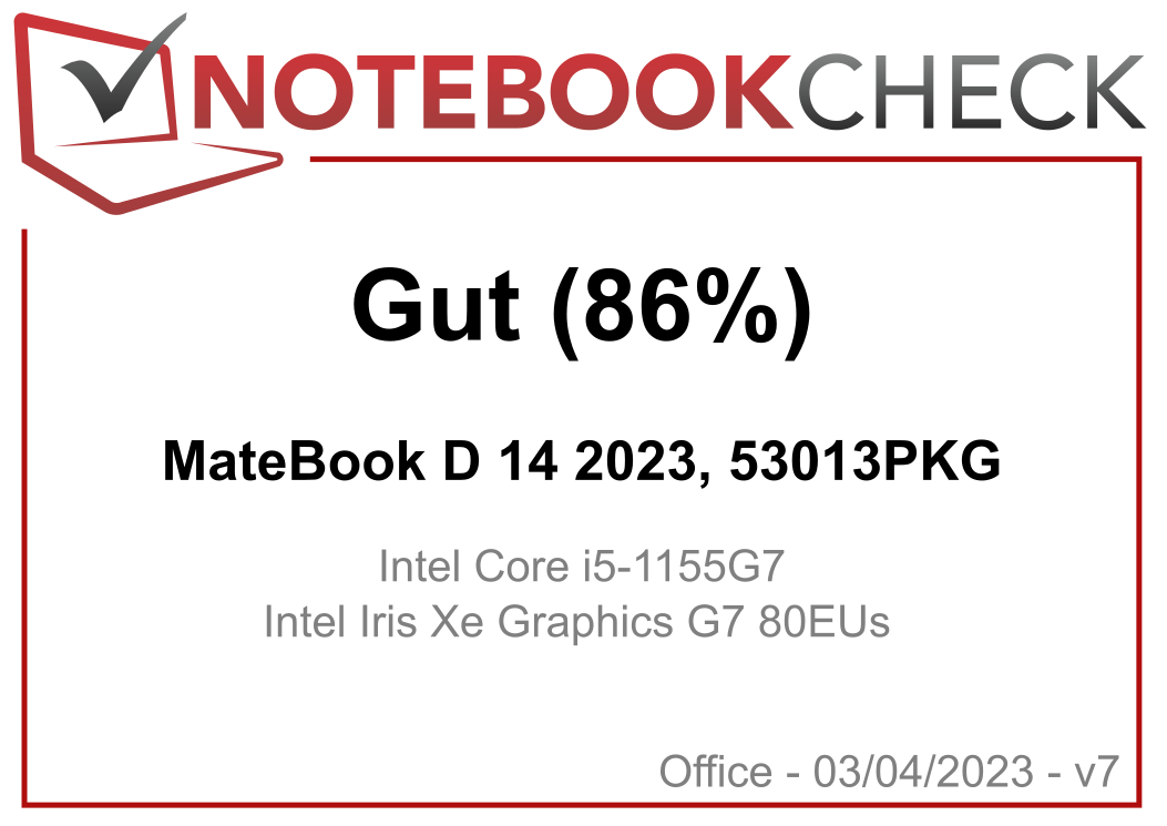 | 85.8 % v7 (old) | 04 / 2023 | Huawei MateBook D 14 2023, 53013PKG i5-1155G7, Iris Xe G7 80EUs | 1.4 kg | 15.9 mm | 14.00" | 1920x1080 | |