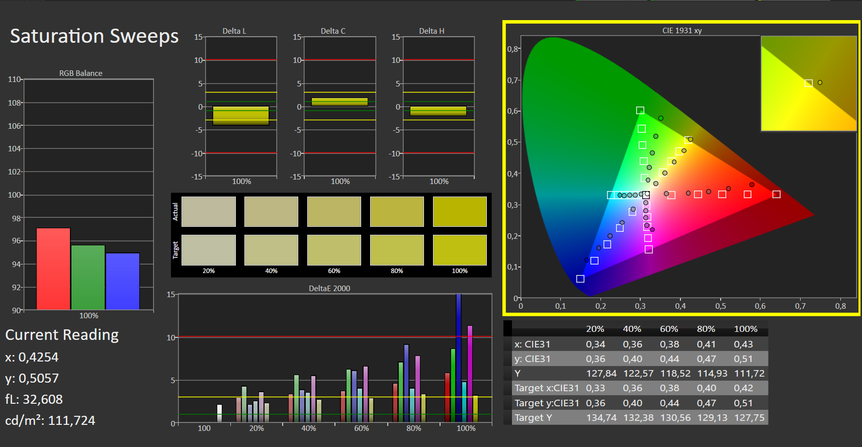 Die Farbabweichungen liegen im Schnitt bei einem Delta-E-Wert von 5, was deutlich über dem Schwellwert von 3 liegt, ab dem Farbdifferenzen vom menschlichen Auge erkennbar werden. Auch nach einer Kalibrierung kann dieser Wert nicht viel verbessert werden (4,21), der leichte Cyan-Stich verschwindet dadurch jedoch. Unser kalibriertes ICC-Farbprofil kann hier heruntergeladen werden.