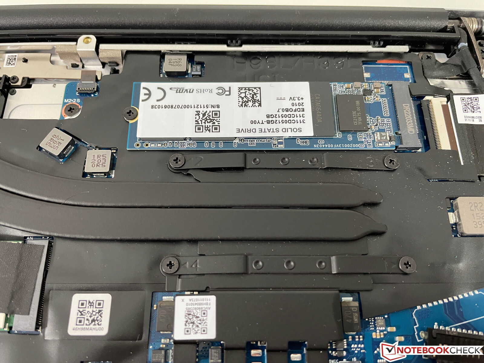 Innerhalb der Vergleichsgruppe gehört das MateBook D 15 zu den kompaktesten und mit seinen 1,6 kg auch zu den leichtesten Modellen. Huawei liefert das bekannte 65-Watt-Steckernetzteil mit, welches mit 200 Gramm ebenfalls nicht besonders schwer ist. Die untere Abdeckung ist mit insgesamt zehn Torx-Schrauben (T5) gesichert und lässt sich leicht entfernen. Im Inneren erhält man Zugriff auf den Lüfter, die M.2-SSD und das WLAN-Modul, der Arbeitsspeicher ist aber verlötet und lässt sich nicht erweitern.