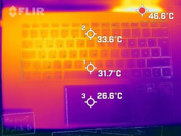 (+) Die Handballen und der Touchpad-Bereich erreichen maximal 33.3 °C und damit die typische Hauttemperatur und fühlen sich daher nicht heiß an.