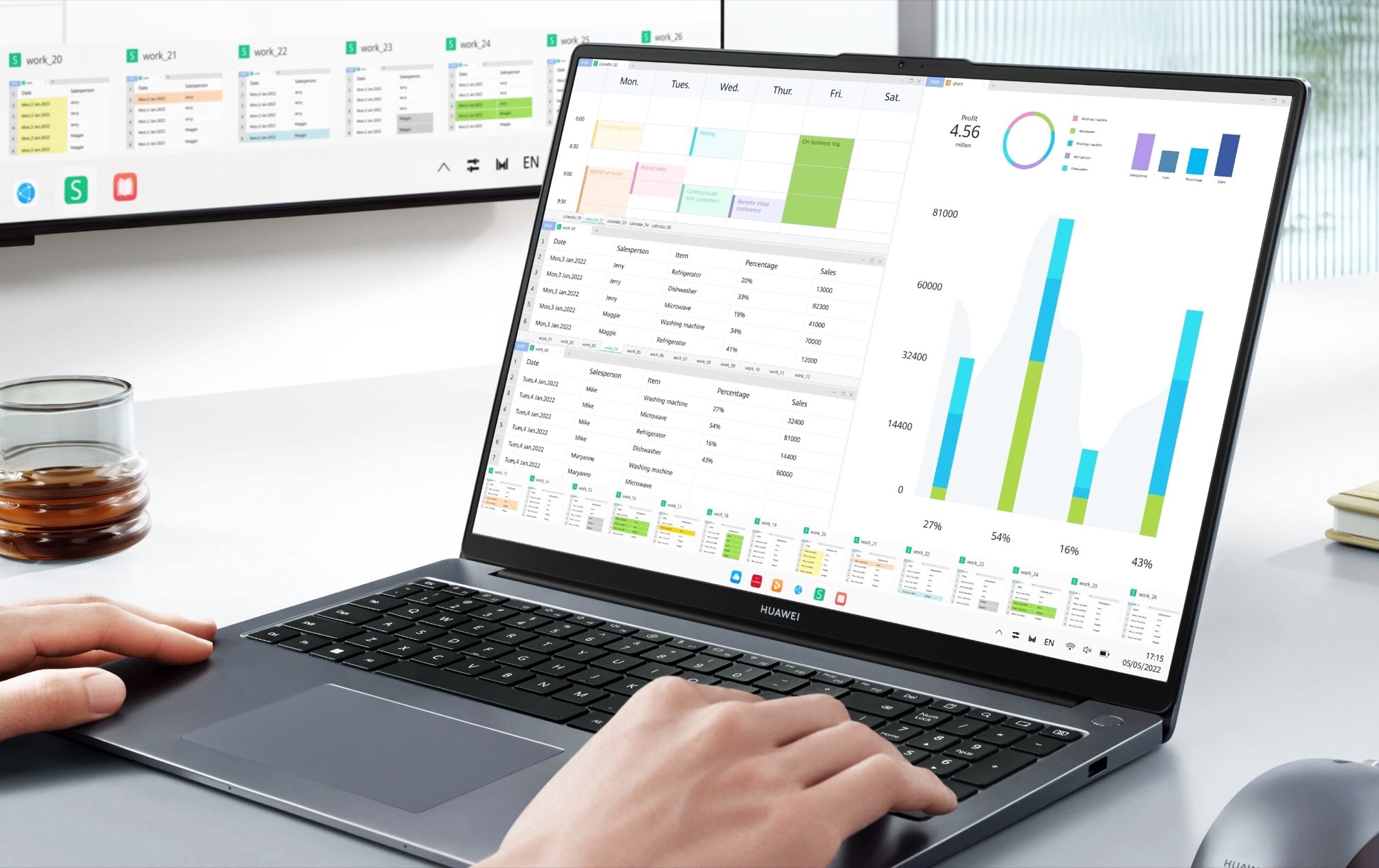 Der Akku fasst je nach Ausstattungsvariante 56 Wh oder 70 Wh, geladen wird über den einzelnen USB-C-Anschluss des Laptops, der dank Support für DisplayPort auch den Anschluss an eine Docking-Station erlaubt. Dazu verbaut Huawei zwei USB-A-Ports, von denen einer allerdings nur USB 2.0 unterstützt, sowie HDMI, Wi-Fi 6, Bluetooth 5.1 und einen 3,5 mm Kopfhöreranschluss. Im Power Button befindet sich ein Fingerabdrucksensor.
