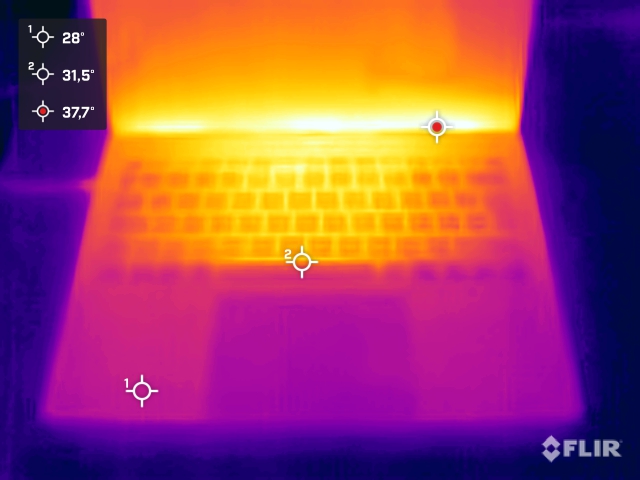 (+) Die Handballen und der Touchpad-Bereich sind mit gemessenen 31.2 °C kühler als die typische Hauttemperatur und fühlen sich dadurch kühl an.