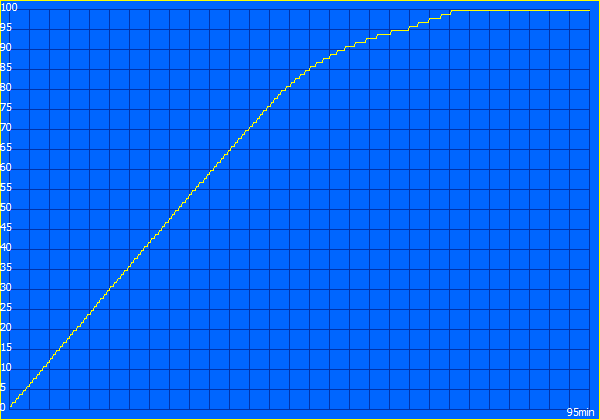 Das Gerät ist relativ schnell wieder aufgeladen. Ein vollständiger Ladevorgang bei eingeschaltetem Gerät dauert nur 95 Minuten, wobei die 80 % schon nach knapp der Hälfte der Zeit überschritten werden.