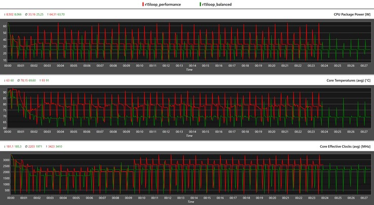 Im Stresstest sehen wir das gleiche Verhalten wie schon bei den reinen CPU-Tests. Kurz nach Beginn darf sich das SoC die 64 Watt genehmigen, um dann im weiteren Verlauf bei 30 Watt unter Dauerlast zu verweilen. Die Taktraten von CPU/iGPU können im Großen und Ganzen aber ziemlich stabil gehalten werden.