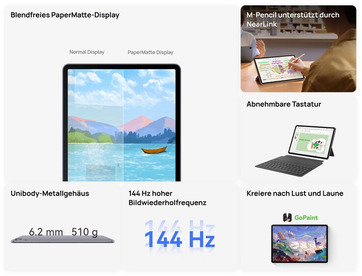 Das ist nicht nur bei Skizzen, Notizen und Co mit dem Eingabestift M-Pencil der 3. Generation mit 10.000+ Druckstufen ein großer Vorteil, sondern macht z. B. auch das Lesen besonders augenschonend. Optional verwandelt sich das Tablet mit der abnehmbaren Tastatur (powered by NearLink) in einen Notebook-Ersatz und ist mit nur 510 g Gewicht und 6,2 mm dünnem Design ein supermobiles Arbeits- und Lern-Setup.