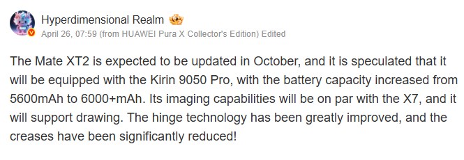 Laut einem Weibo-Post des Leakers Hyperdimensional Realm plant Huawei, das Mate XT2 im Oktober dieses Jahres vorzustellen. Das chinesische Unternehmen hat bisher zwar noch nichts bestätigt, der Leak vermittelt aber bereits einen guten Eindruck davon, was vom kommenden Gerät zu erwarten ist.