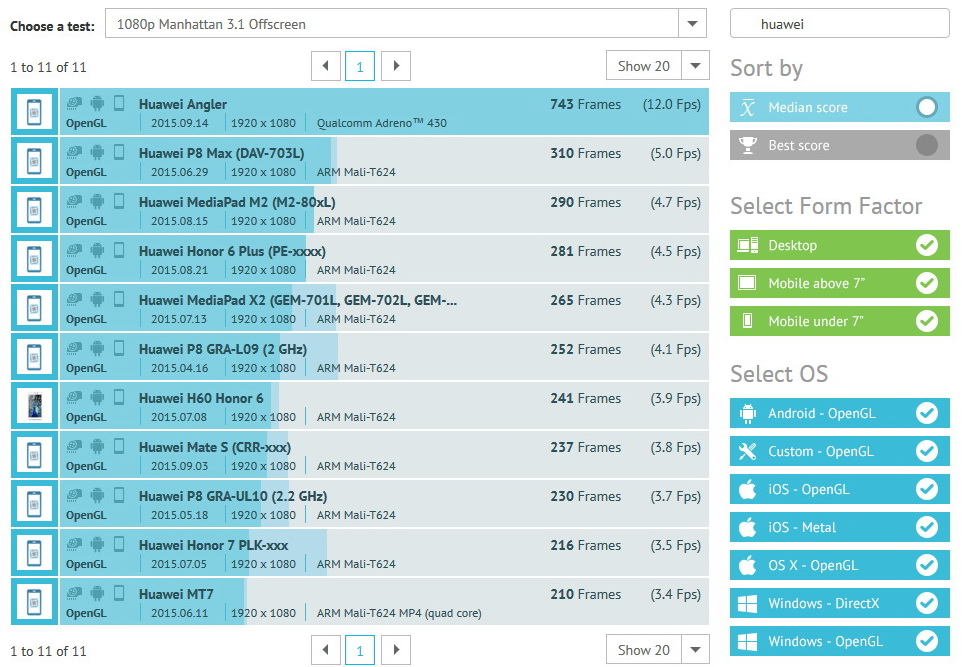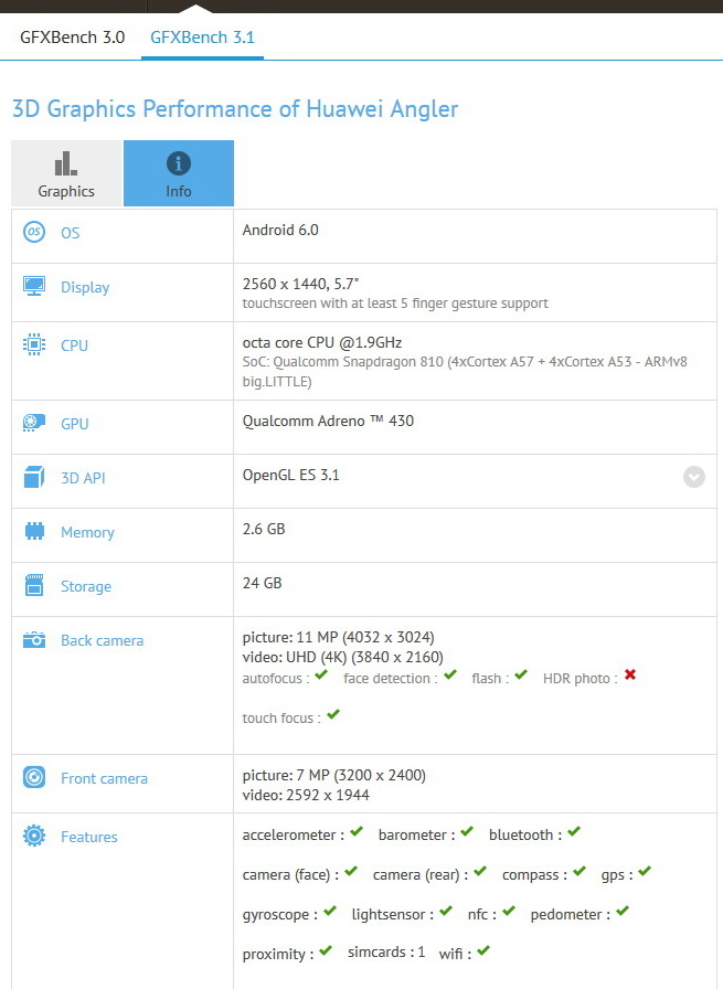 Wer die Suche im GFXBench 3.1 Benchmark mit dem Begriff "Huawei" füttert, erhält prominent die Modellbezeichnung "Huawei Angler" und detailliertere Informationen zur Ausstattung des Nexus 6 2015 präsentiert. Demnach dürften sich die zahlreichen Gerüchte zu der nächsten Nexus-6-Generation bestätigen. Neben einem Snapdragon 810 mit Adreno 430 verfügt das "Angler" über ein 5,7-Zoll-Display mit 2560 x 1440 Pixeln und 32 GB eMMC.