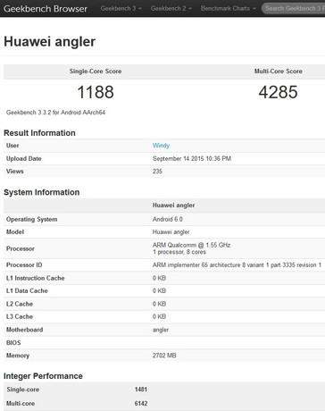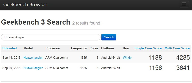 In der Geekbench 3 Suche finden sich aktuell 2 Ergebnisse zu dem Suchbegriff "Huawei Angler" mit Single-Core-Scores von 1156 und 1188 Punkten. Für die Multi-Core-Scores werden 3641 und 4285 Punkte gelistet. Gemäß dem Datenbankeintrag arbeitet das Nexus 6 des Jahrgangs 2015 bereits mit Googles Android 6.0 Marshmallow und hat 3 GB RAM an Bord.