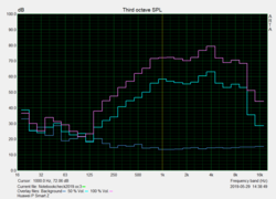 Die Maximallautstärke des Monolautsprechers auf der Geräteunterseite ist mit 85 dB(A) ausreichend laut. Die gebotene Klangqualität ist aber nur durchschnittlich. Bei unserer Pink-Noise-Messung zeigt das Diagramm eine nur wenig lineare Wiedergabe von Mitten und Höhen. Gerade im Bassbereich herrscht ein erwartungsgemäßes Defizit.