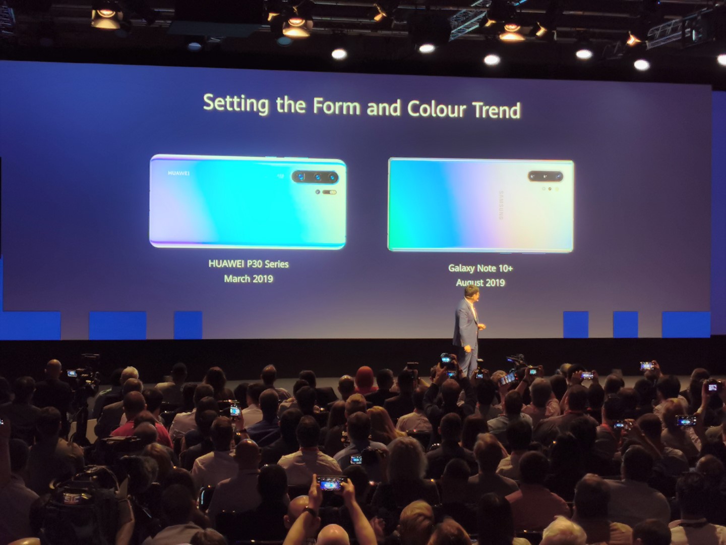 Im Rahmen der Präsentation wiederholte Huawei einige der wichtigsten Foto-Features des bekannten Flaggschiffs und ging auch auf die jüngsten Software-Updates ein, die etwa einen Night-Mode für Selfies nachrüstete. Hier tauchte auch der Name Samsung des Öfteren auf, wie so oft verglich sich Huawei nicht nur mit Apple sondern auch mit dem Erzkonkurrenten aus dem Android-Lager. Thema waren nicht nur die Vorteile der Huawei-Kamera-Lösung sondern auch das Design, das sich ja mit dem Galaxy Note 10 sehr auffällig in Richtung Huawei veränderte. Die folgenden Folien sorgten jedenfalls für ordentlich Gelächter im Saal.