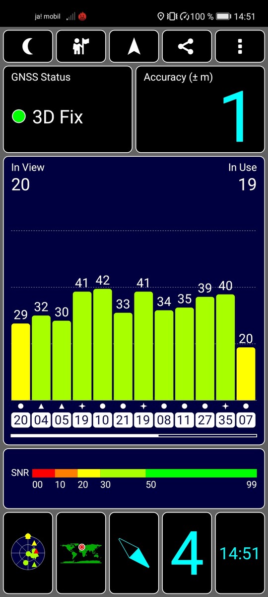 Das Huawei P40 Lite 5G kann seinen Standort über GPS, GLONASS, Beidou und Galileo sowie QZSS bestimmen. Mit der App "GPS-Test" erreichen wir damit im Freien eine sehr gute Genauigkeit von einem Meter, in geschlossenen Räumen war hingegen keine Ortung möglich.