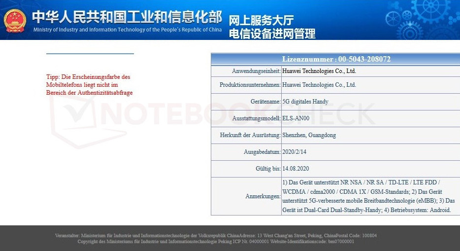Huawei wird seine P40 Smartphone-Serie, die aus bis zu 5 Modellvarianten bestehen soll, Ende März in Paris offiziell vorstellen. In China sind jetzt vier Modelle der Huawei P40-Handyserie bei den Zulassungsbehörden aufgetaucht wie entsprechende Datenbankeinträge bei der Tenaa zeigen. Dort sind bereits als Neueinträge die Modelle ANA-AN00 und ANA-TN00 als Huawei P40 sowie ELS-AN00 und ELS-TN00 als Huawei P40 Pro gelistet.