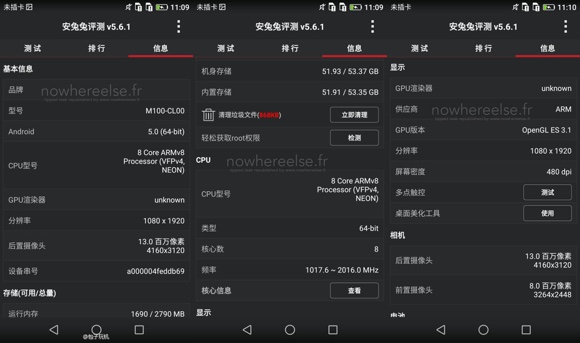 Das Magazin hat außerdem angebliche Screenshots des AnTuTu-Benchmarks veröffentlicht. Sie zeigen die technischen Daten des Huawei P8. Die Specs entsprechen bisherigen Leaks (wir berichteten). So ist das neue Huawei-Flaggschiff angeblich mit einem Octa-Core-Chip des Herstellers mit 64-Bit-Unterstützung namens Kirin 930 ausgestattet. 3 GB RAM begleiten den Prozessor. Das Display misst 5,2 Zoll und löst mit 1.920 x 1.080 Pixeln auf. Der interne Speicher beträgt 64 GB. Die Hauptkamera löst mit 13 Megapixeln auf und die Frontkamera, wie beim Vorgänger, mit acht Megapixeln. Als Betriebssystem dient Android 5.0 Lollipop. Das AnTuTu-Benchmarkergebnis beträgt 47.426 Punkte. Damit ordnet sich das Huawei P8 neben anderen High-End-Smartphones ein.