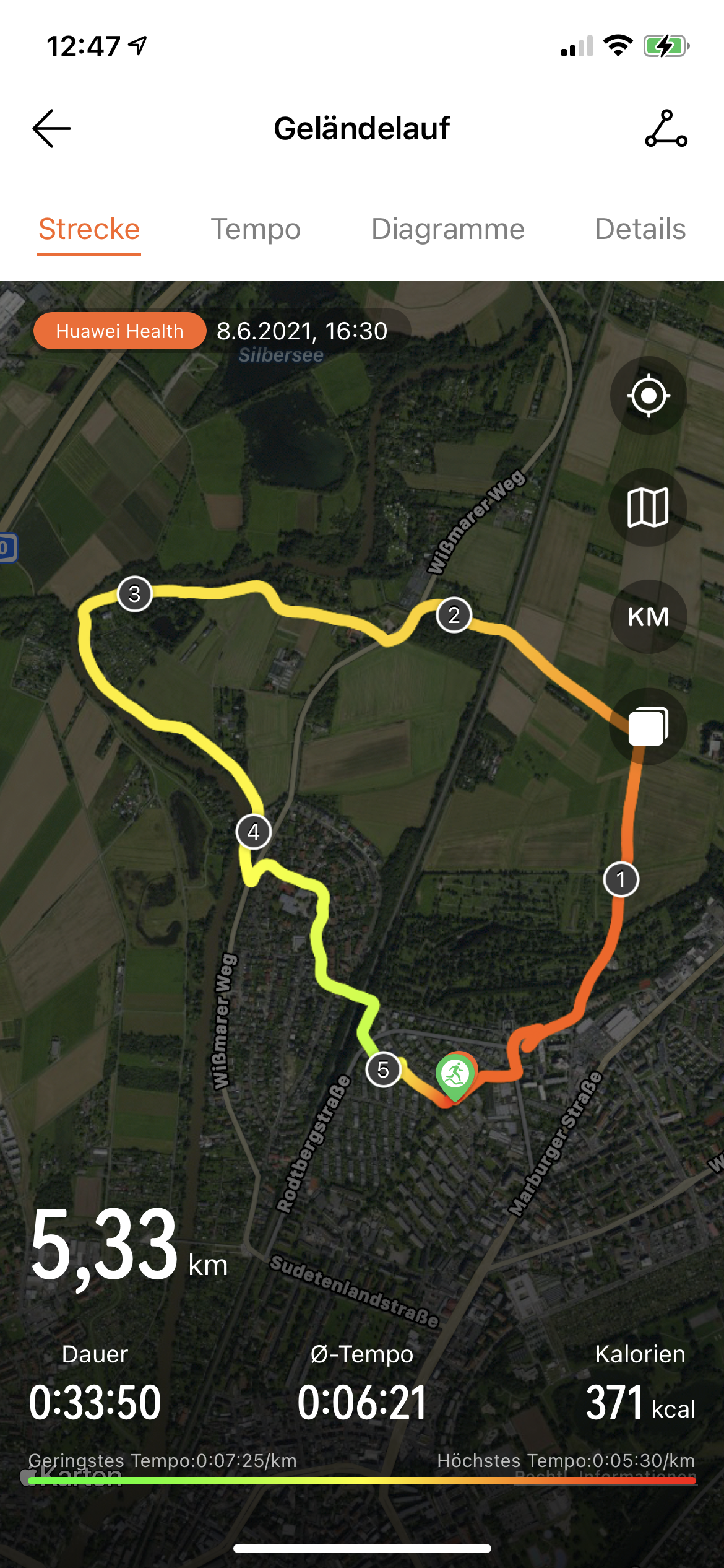 Die Trainings-App von Huawei bietet mehr als 100 Sportmodi und zusätzlich 13 Laufkurse für Anfänger und fortgeschrittene Läufer. Gehen und Laufen (drinnen oder draußen) sowie das Training auf dem Crosstrainer und der Rudermaschine erkennt die Watch automatisch und fragt den Nutzer, ob er ein Workout starten möchte. Beim Gehen kam die Anfrage nach etwa 1 km. Dieser erste Kilometer floss am Ende auch in die Gesamtdistanz mit ein, fehlte aber in der Routenaufzeichnung, die erst ab dann begann.