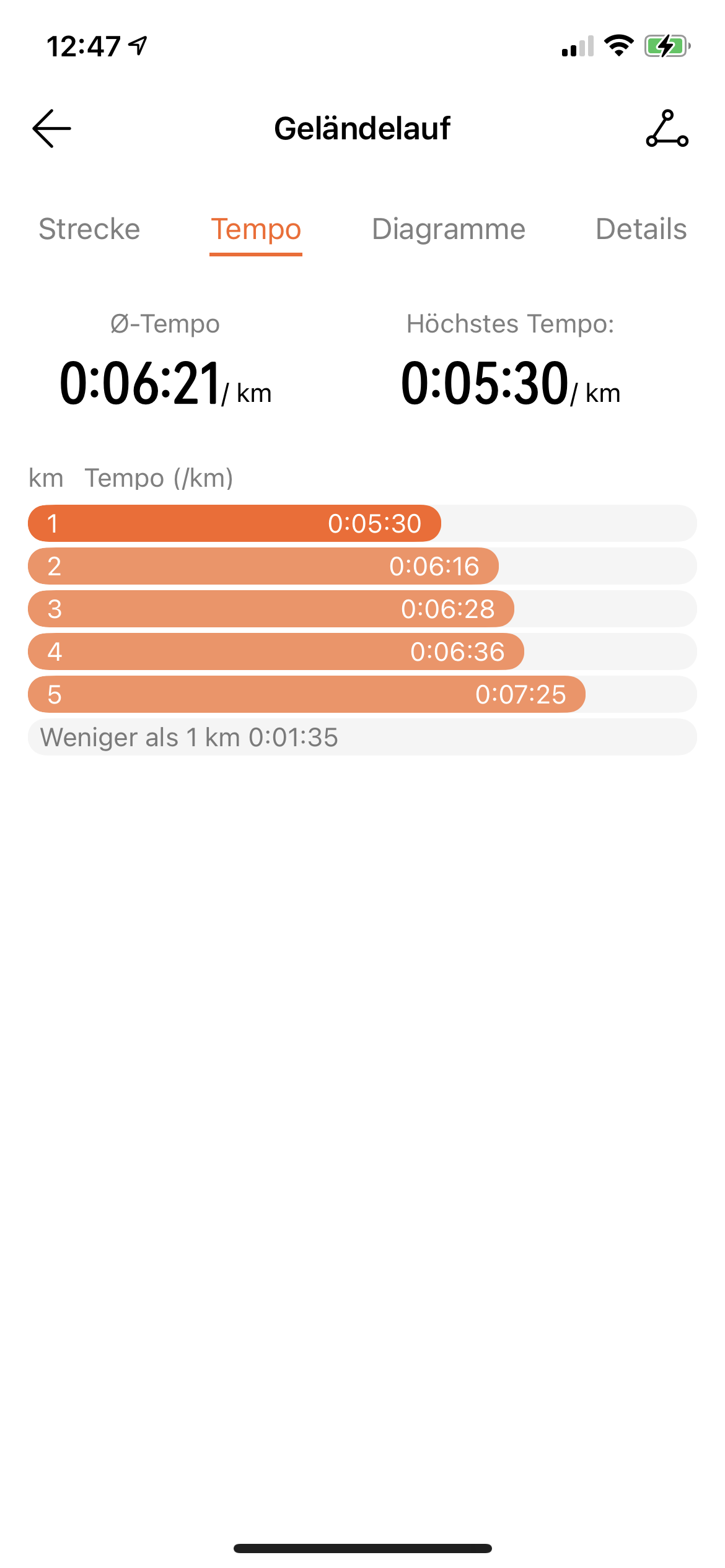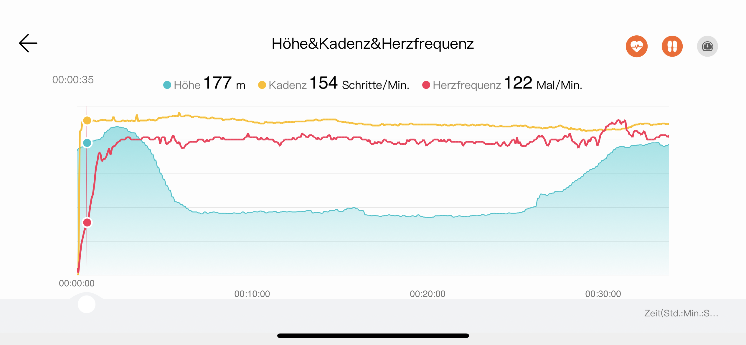 Die folgenden Smartphone Screens geben ein Protokoll nach einem Lauf wieder. Alle Diagramme lassen sich vergrößern und mit anderen Kurven überlagern, wenn man das Smartphone ins Querformat dreht wie im vorletzten Screen.