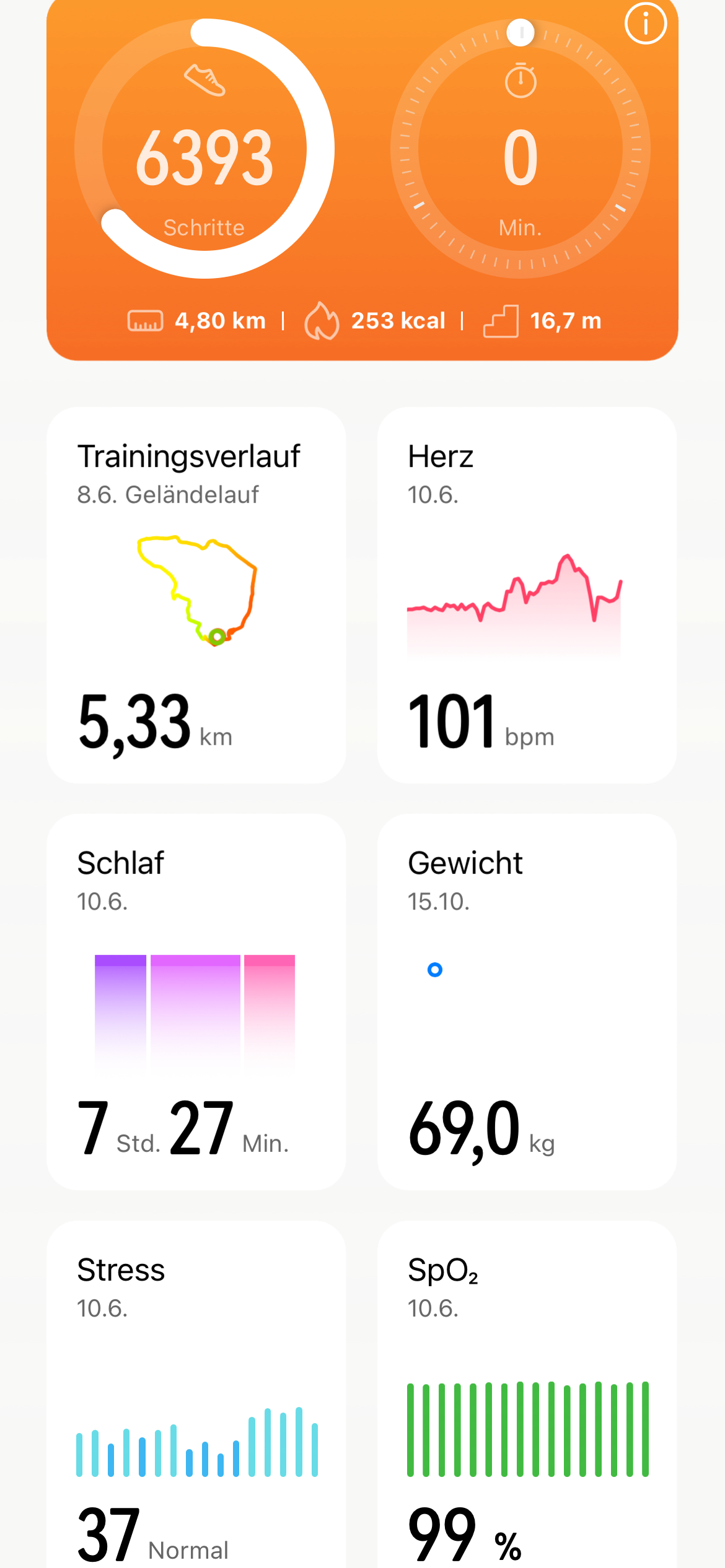 Die Diagramme kann man auf der Uhr einsehen und im Dashboard der Health-App, die zusätzlich die Verläufe über längere Zeit darstellt. Auf dem iPhone kann man die Health-App mit Apple Health verbinden, unter Android mit Google Fit.