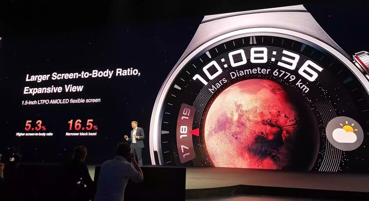 Die Huawei Watch 4 und die Huawei Watch 4 Pro setzen auf praktisch dieselbe Ausstattung, das Pro-Modell ist mit einem Durchmesser von 48 Millimetern aber etwas größer, und mit einem LTPO-AMOLED-Display mit einer Diagonale von 1,5 Zoll ausgestattet, das dank 16,5 Prozent dünnerer Bildschirmränder im Vergleich zur Huawei Watch 3 eine um 5,3 Prozentpunkte größere Screen-to-Body-Ratio erreicht.
