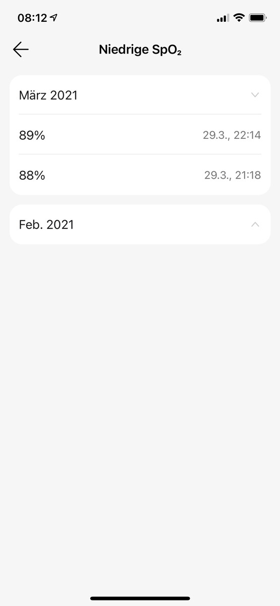 Über die Protokollierung der Sättigung hinaus gibt die Watch Fit auf Wunsch eine Warnung aus, wenn sie unter eine vorgegebene Grenze sinkt. Im Test kam das vor. Die Sättigung lag mit 89 % nur knapp unter der eingestellten Grenze von 90. Alternative Grenzwerte sind 85, 80 oder 75 %. Im erlebten Fall normalisierte sich die Sättigung rasch wieder. Die Kontrollfunktion der automatischen Messung ist vor dem Hintergrund, dass auch bei einer COVID-19-Infektion in der Regel die Sättigung sinkt, derzeit dennoch kaum zu unterschätzen.